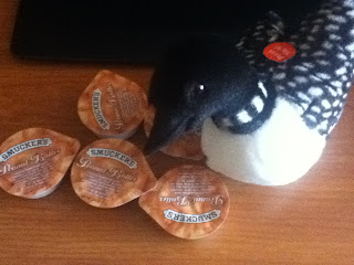 Today began with continental breakfast and a realization that I adore early mornings: sunshine, coffee, and alone time to reflect and begin my day. I hijacked some peanut butter to bring to Japan too (pictured below with my loon that makes dinosaur noises):